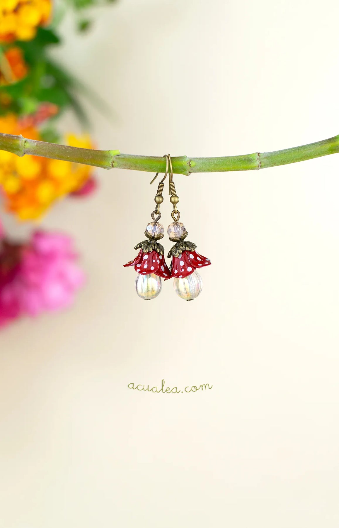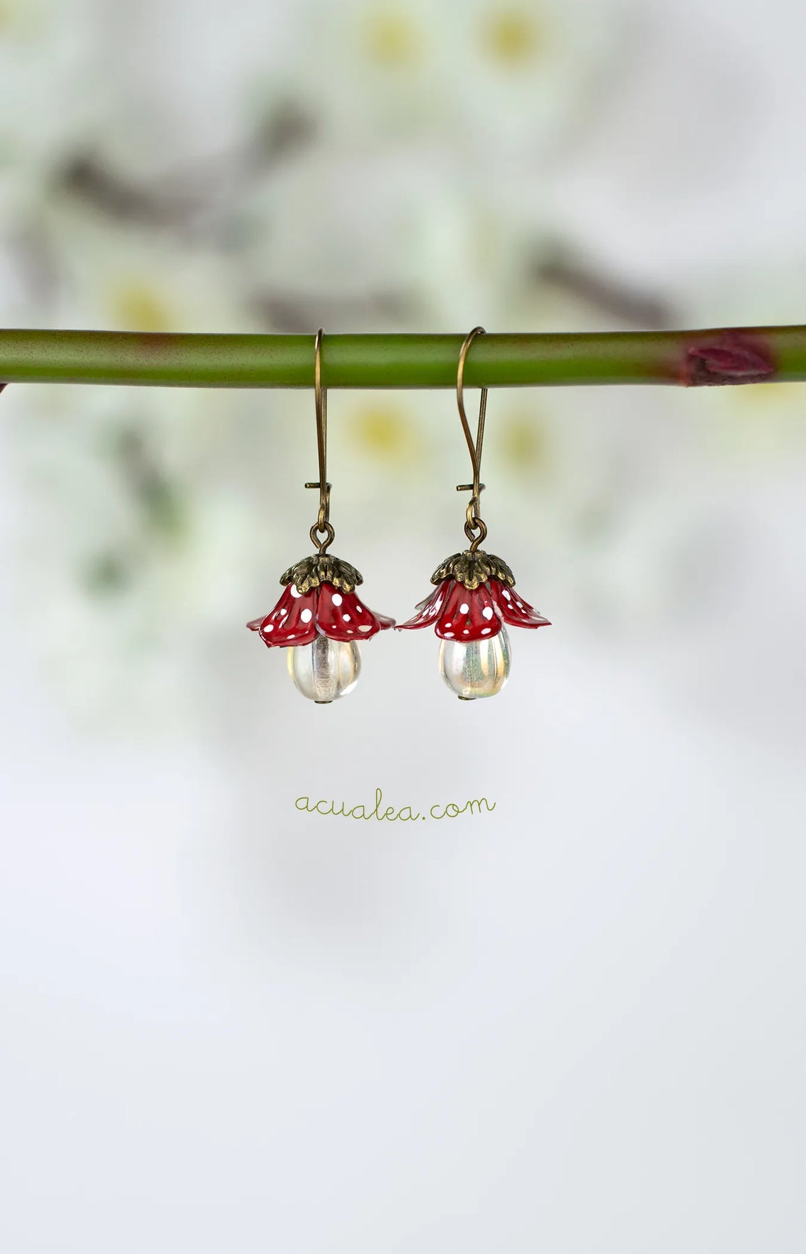 Hand-painted in deep red with delicate white details, each miniature mushroom reveals a faceted Czech crystal stem shaped like a soft melon drop, bringing subtle light and movement to the design.