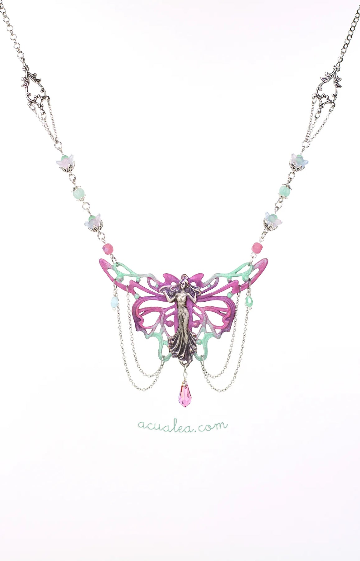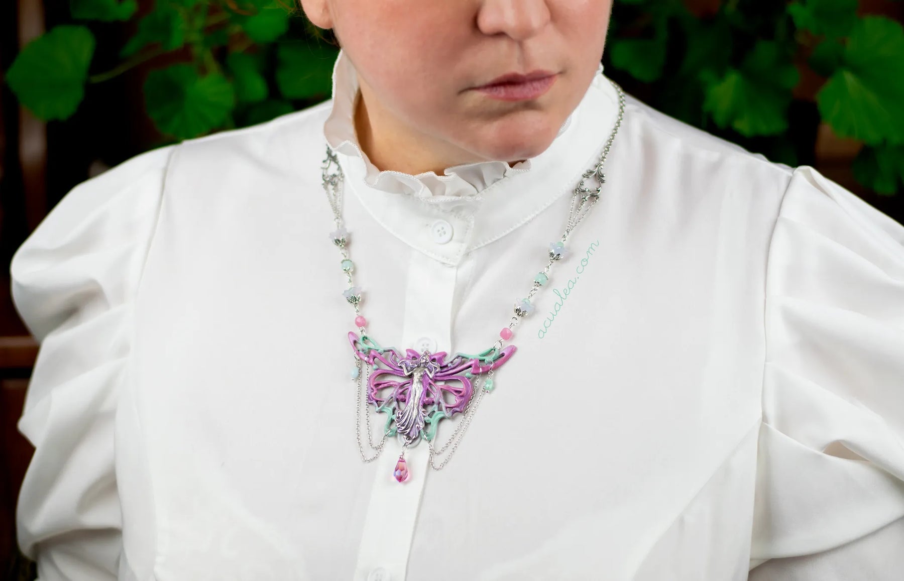 Handcrafted fantasy fairy necklace, hand painted in purple, inspired by Art Nouveau, AcuaLea Designs
