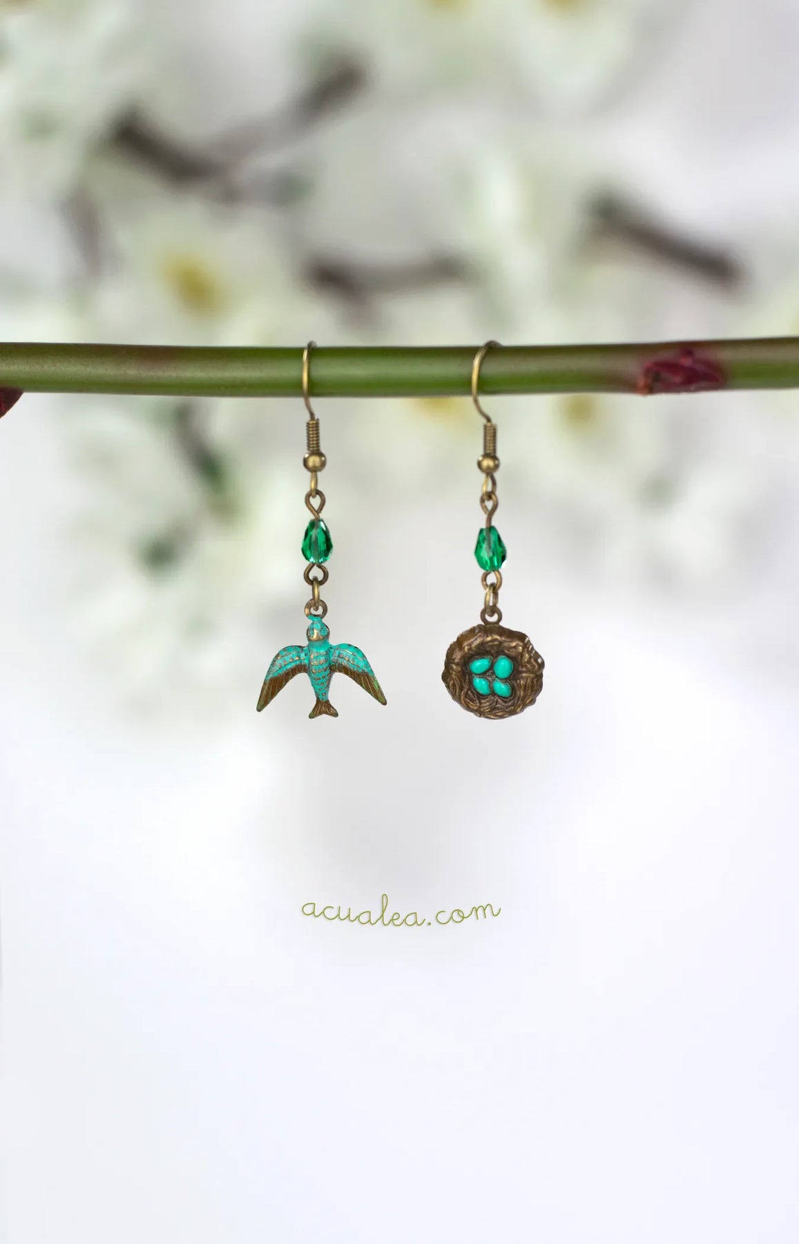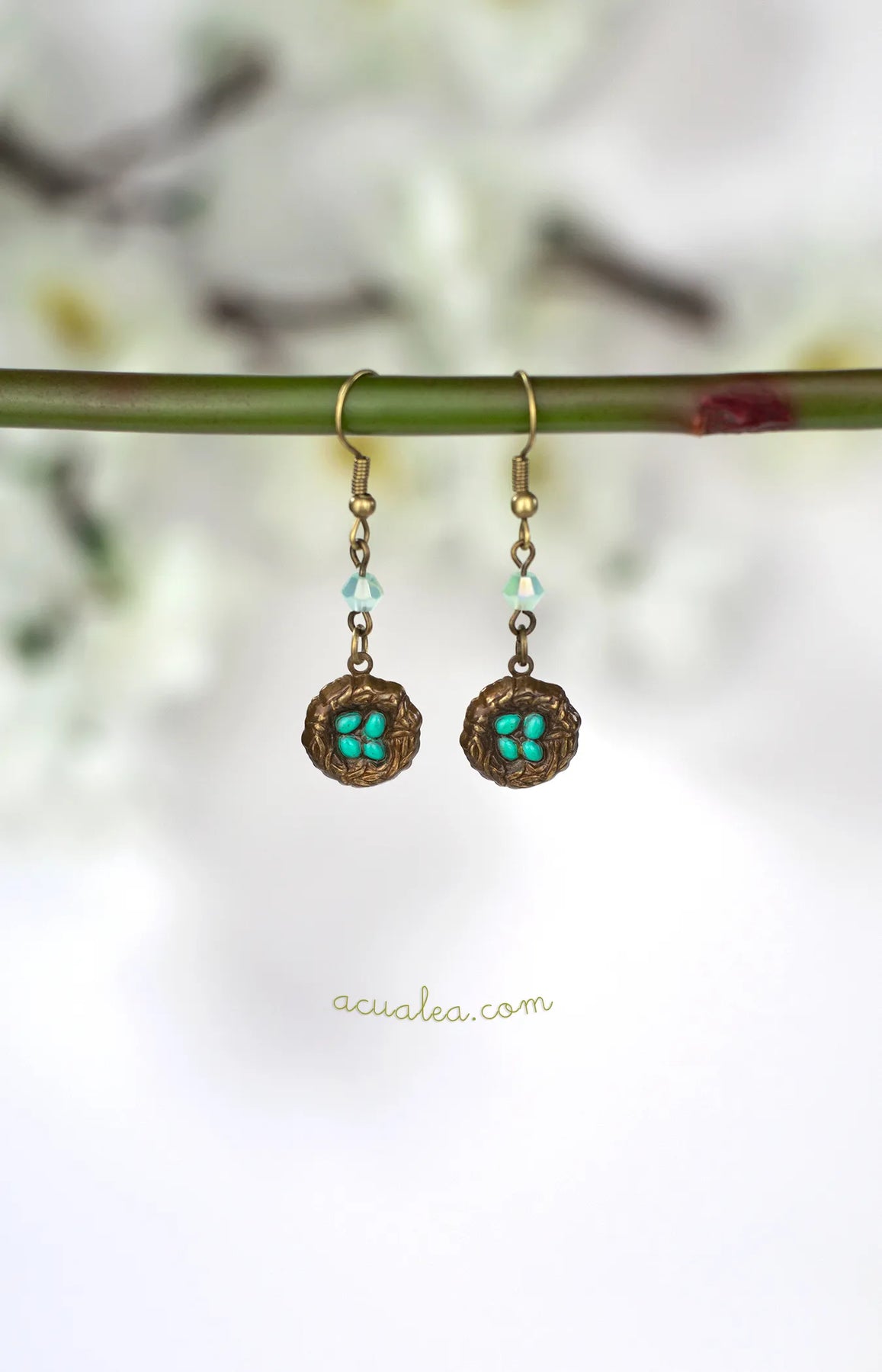 Each delicate design features a tiny nest with turquoise-blue eggs inspired by the American robin, hand-painted with soft patinas that bring warmth and life to the brass surface. Czech crystal accents catch the light with subtle shimmer, like morning dew resting on fresh leaves.
