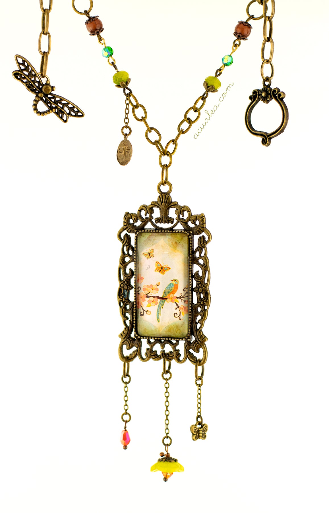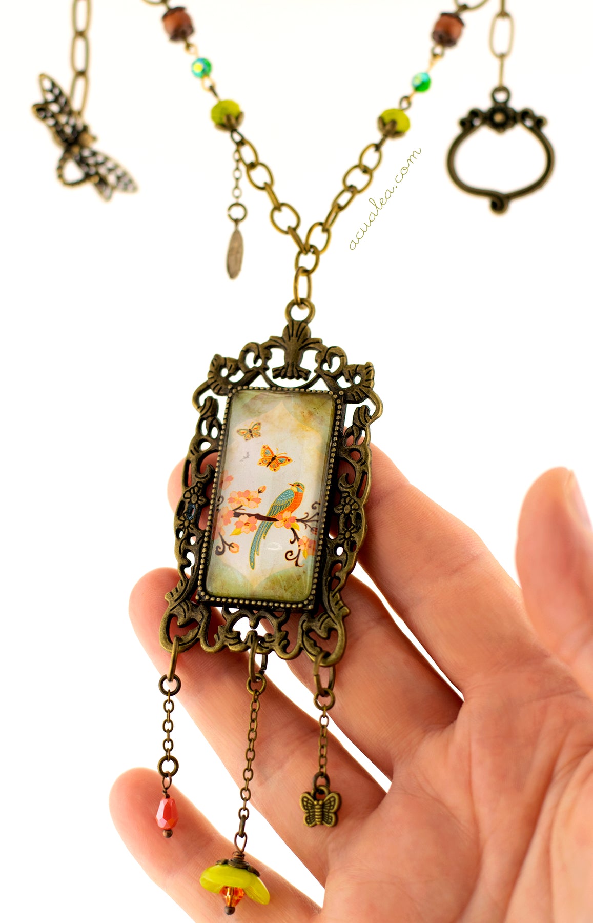 This necklace showcases a miniature print of an original digital illustration by AcuaLea, beautifully framed in a vintage-style brass pendant. The artwork features delicate cherry blossoms, butterflies, and a vibrant Kingfisher inspired bird, evoking a sense of serene nature.