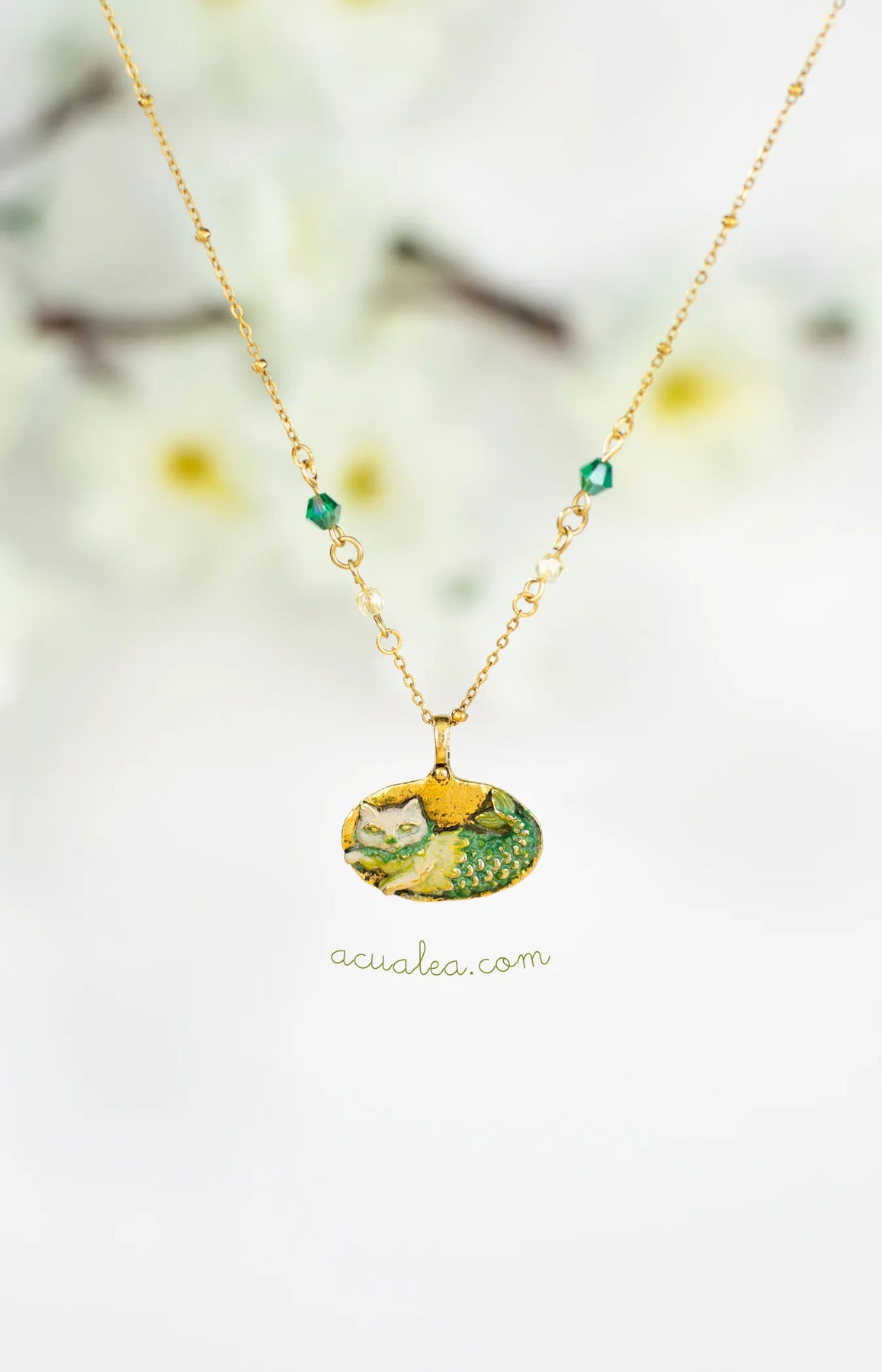 Mermeow Necklace gold pendant featuring a hand-painted cat mermaid design with green details and crystal accents, fantasy jewelry by AcuaLea.