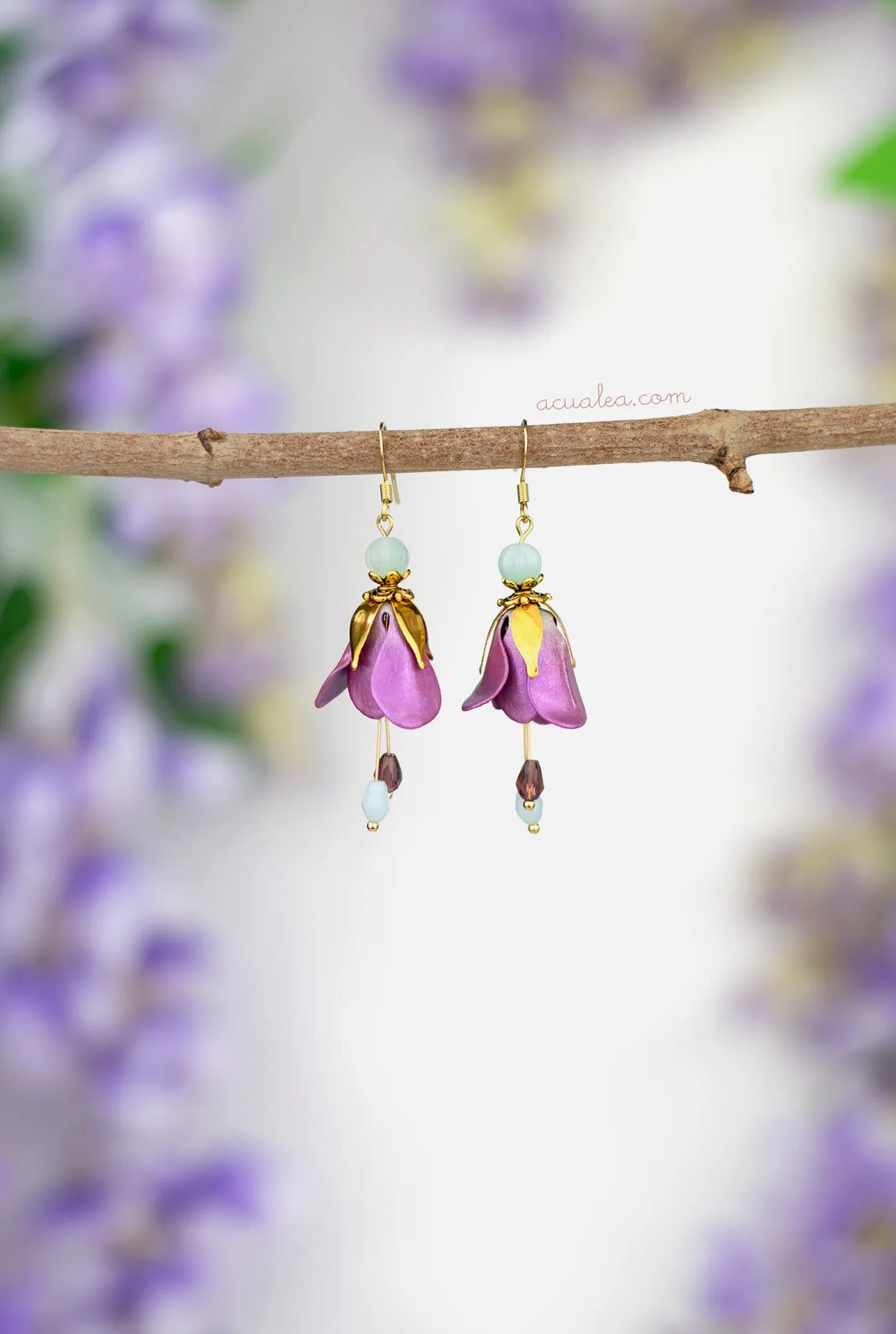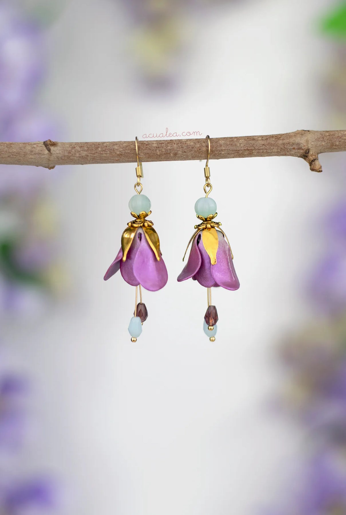 These enchanting Bellflower drop earrings from the Fantasy Flowers Collection are hand-painted with light purple and teal iridescent patinas, capturing the beauty of nature. Inspired by delicate petals, the earrings shimmer with an ethereal glow, creating a sense of timeless fantasy.