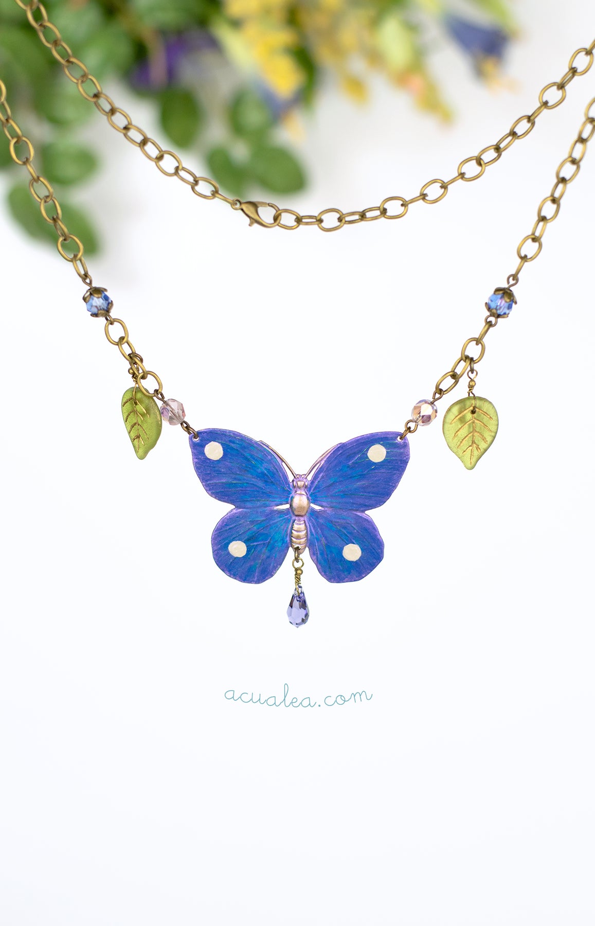 magical Handcrafted butterfly necklace, hand painted in blue, inspired by nature, with Czech crystals, by AcuaLea Designs