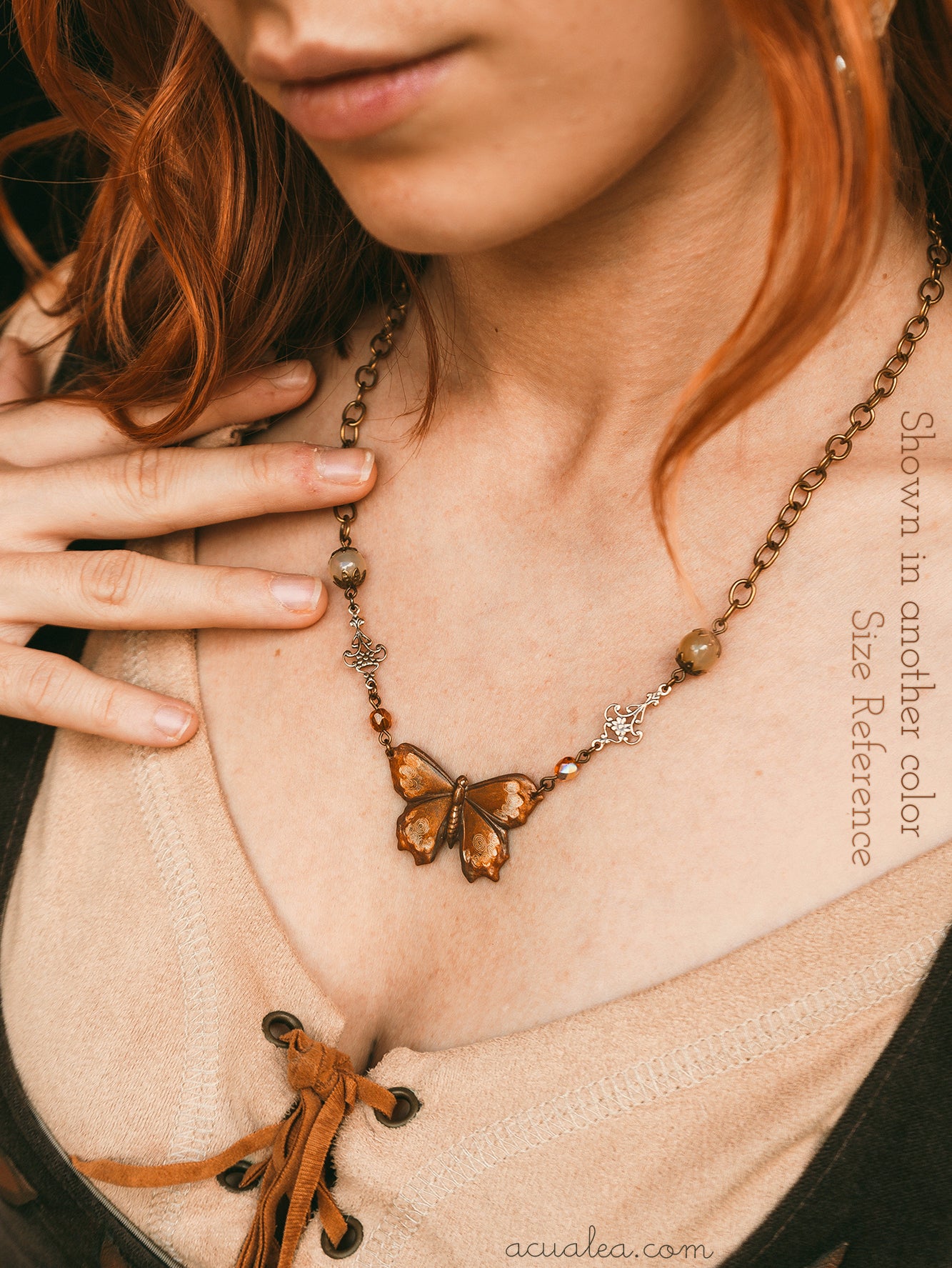 El collar "Sueños de Mariposa Azul" simboliza la transformación y la libertad. Una mariposa pintada a mano despliega sus alas luminosas en tonos turquesa y azul, como una joya efímera del cielo que evoca asombro y horizontes infinitos.