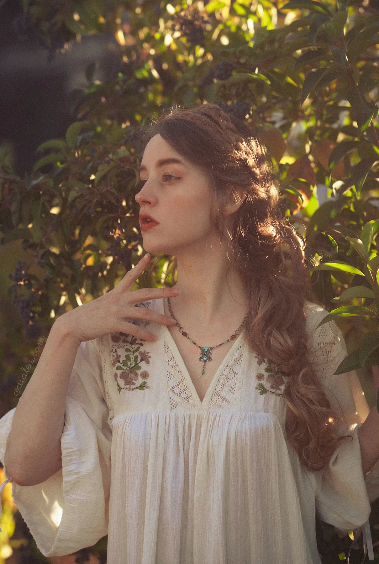 model with Hand-painted Art Nouveau lily necklace with Czech crystal beads and turquoise patina details, romantic style