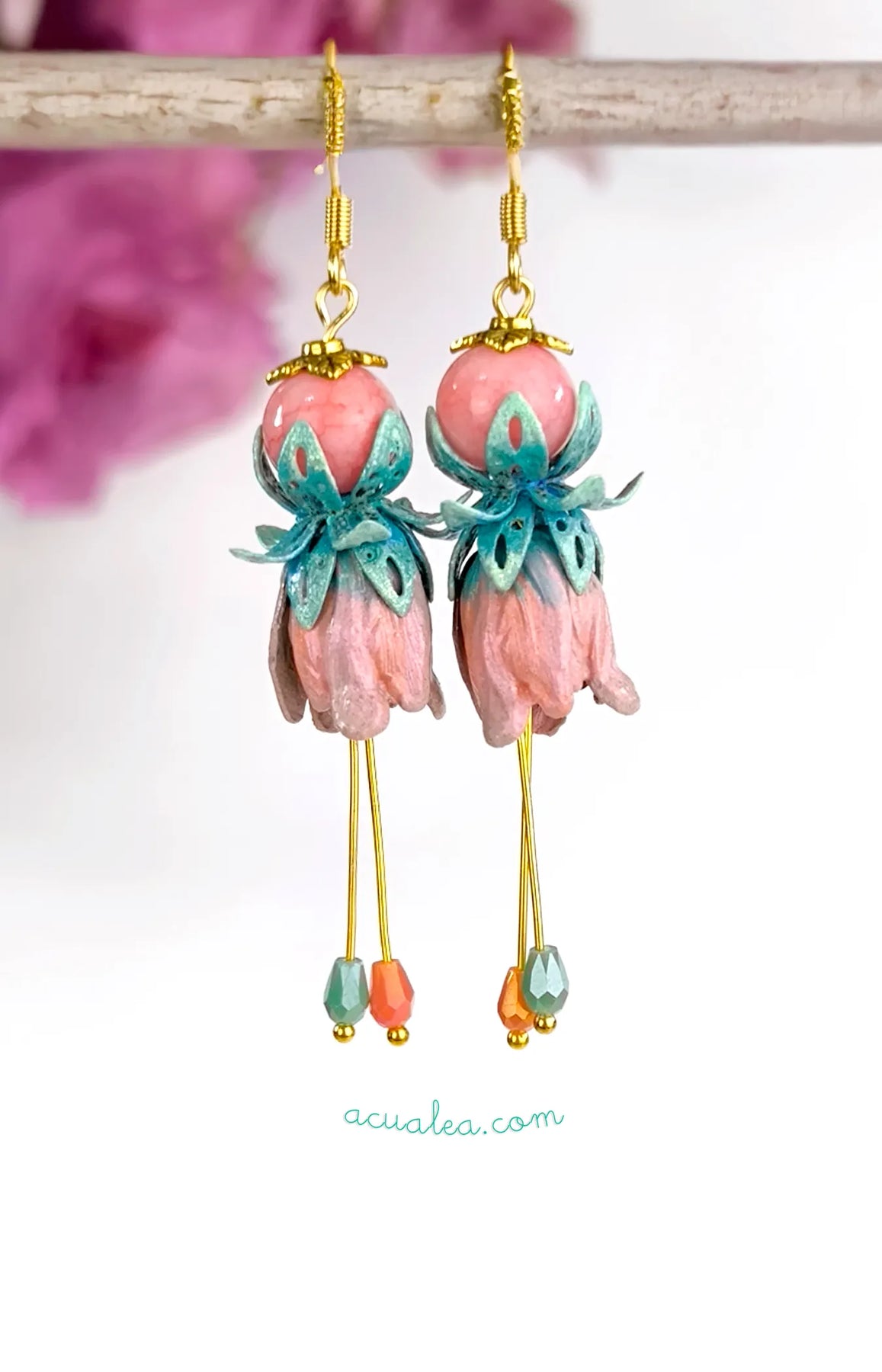 Enchanted Rose Dew Earrings in soft pink and turquoise tones with gold hooks and crystal drops, handcrafted floral fantasy earrings by AcuaLea.