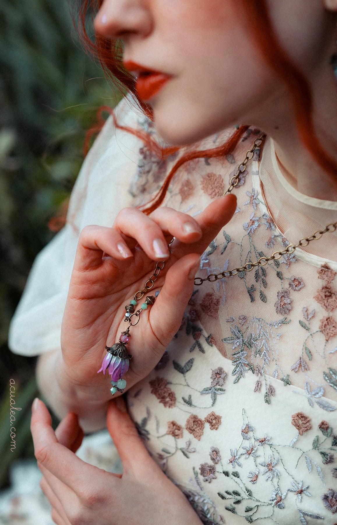 Assemblé à la main avec des pétales peints à la main en violet, magenta et turquoise, des perles facettées tchèques et une chaîne en laiton vieilli, ce collier reflète l’esprit romantique de la Collection Fleurs de Fantaisie de AcuaLea Designs.