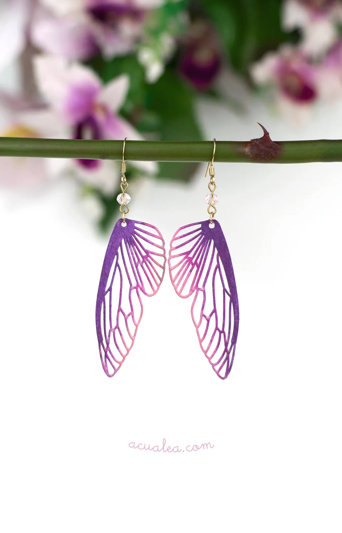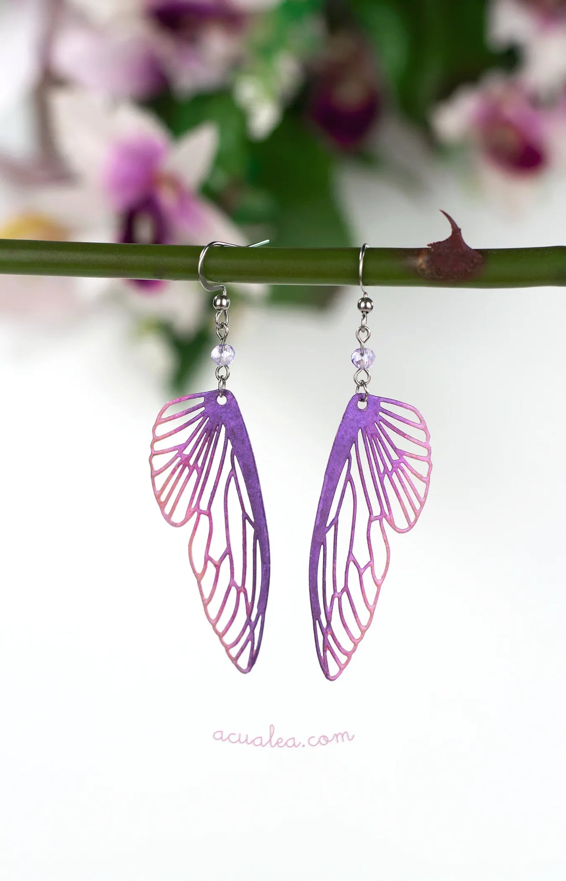 Chaque paire est délicatement façonnée et peinte à la main, révélant de subtiles transitions de couleur qui changent avec la lumière. Une petite goutte de cristal tchèque apporte mouvement et éclat délicat, tel un reflet suspendu en plein vol.