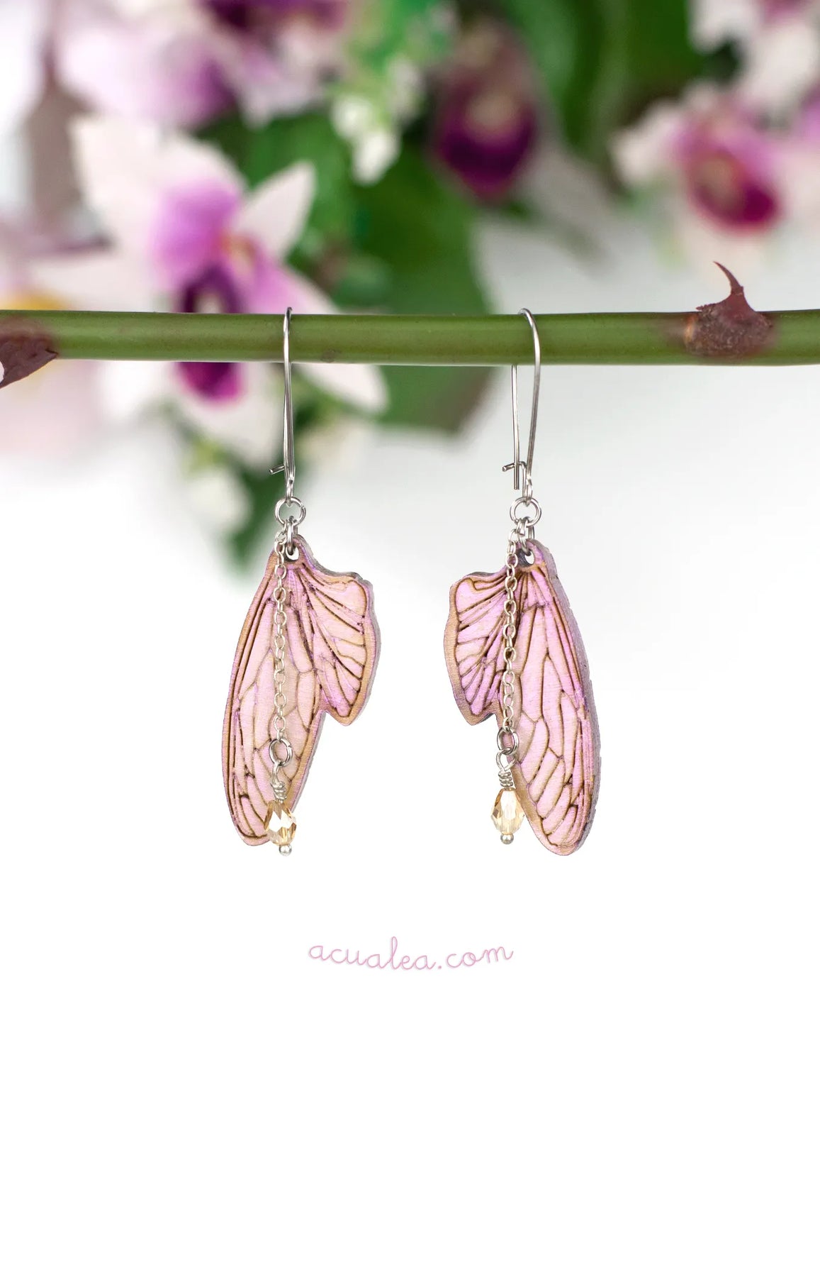 Fantasy fairy wing earrings hanging from a natural branch