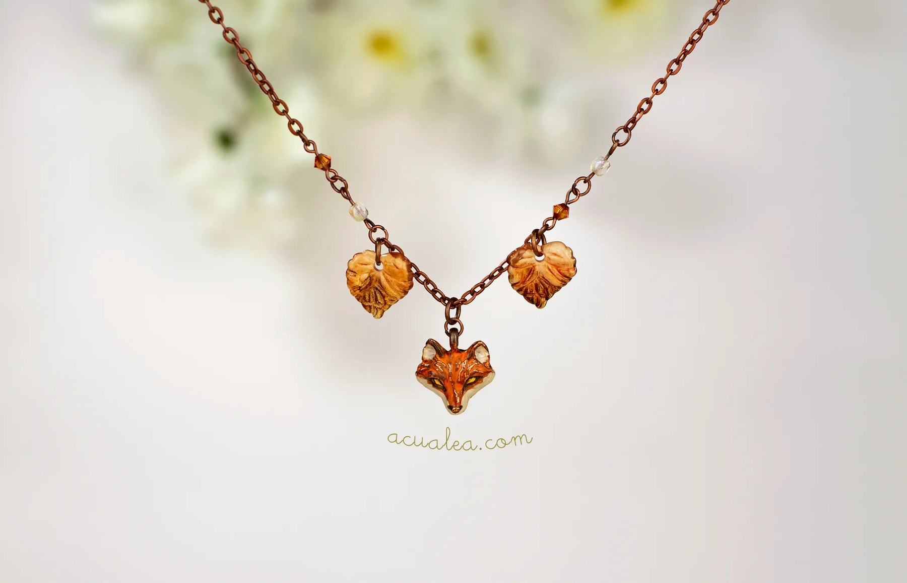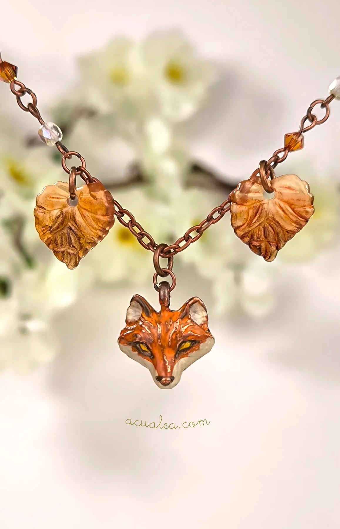En son centre repose un délicat renard sculpté, accompagné de feuilles en acrylique dépoli doucement translucides, peintes à la main dans des tons chauds et terreux. Suspendu à une chaîne en cuivre et illuminé par de subtils reflets de cristal, l’ensemble paraît à la fois enraciné et lumineux, comme un souvenir recueilli le long d’un sentier secret de la forêt.